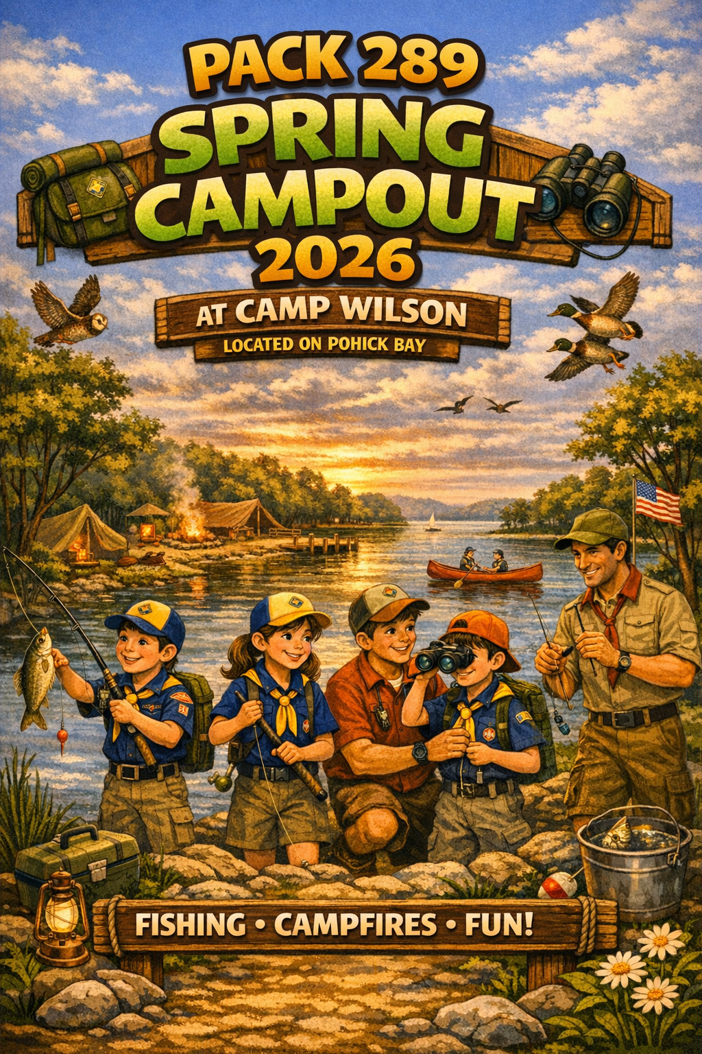 Pack 289 is blasting into spring with a weekend of tents, trails, and unstoppable Scout energy as we take over Camp Wilson, nestled along the beautiful shores of Pohick Bay, for a FREE family campout powered by this year’s amazing popcorn sales! Webelos arrive Friday, April 17th for bonus skills, leadership moments, and early‑access waterfront exploration, while all other Dens roll in on Saturday, April 18th ready for a full day of games, hikes, nature adventures, songs, skits, and the kind of campfire chaos that ranges from “surprisingly well‑rehearsed” to “we’re not sure what just happened but everyone’s laughing.” Bring the whole family, pack your best Scout spirit, and get ready for marshmallows, memories, and a spring weekend that delivers pure Pack 289 magic.